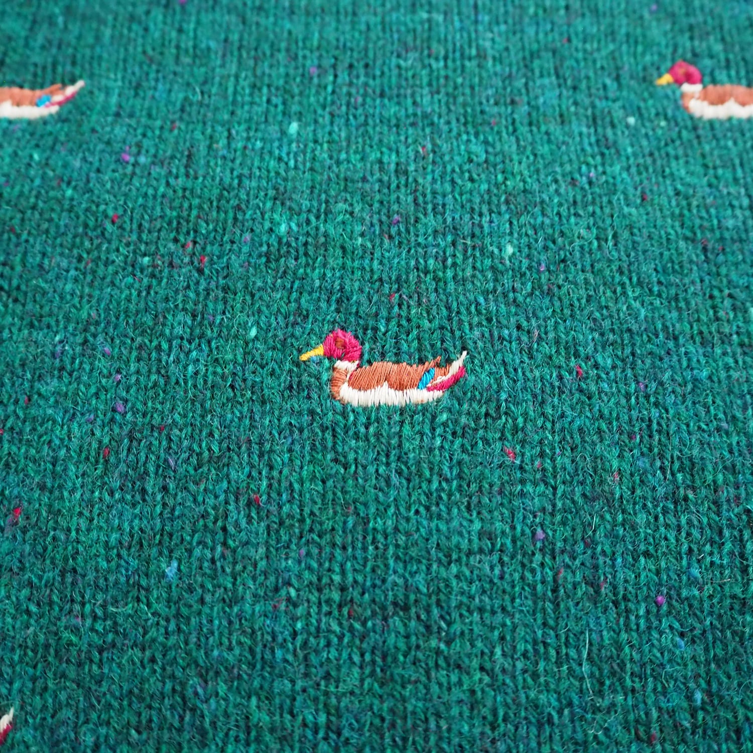グリーンベースに多数のカモが刺繍され